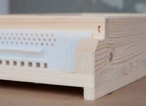 Das Kärntner Magazin ist vor allem im Raum Kärnten sehr beliebt und hat auch daher seinen Namen. Ursprünglich waren die Zargen isoliert (mit Hartfaserplatte und Styropordämmung) und um die Holzzarge auf die alten isolierten anwenden zu können, wurde die Lösung mit dem Kranz gefunden. Die Wandstärke beträgt wie bei allen Maßen ebenso 25 mm und es kann darin in der Quer- und Längsbauweise geimkert werden – je nachdem welche der zwei vorhandenen Maße man wählt. Beim Kärntner Magazin wird bewusst auf den Falz ander Unterseite verzichtet, da eine außen angebrachte Leiste das Verrutschen der Zargen verhindert und wie bereits erwähnt, das Kombinieren mit den alten isolierten Zargen ermöglicht.