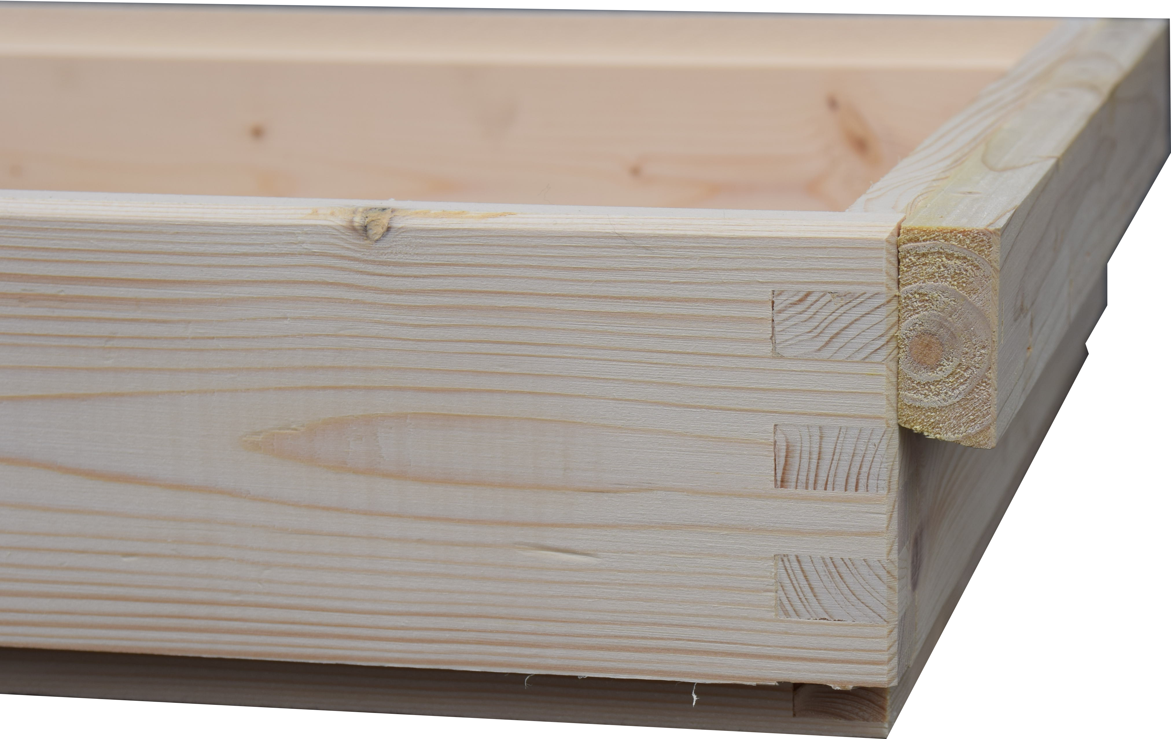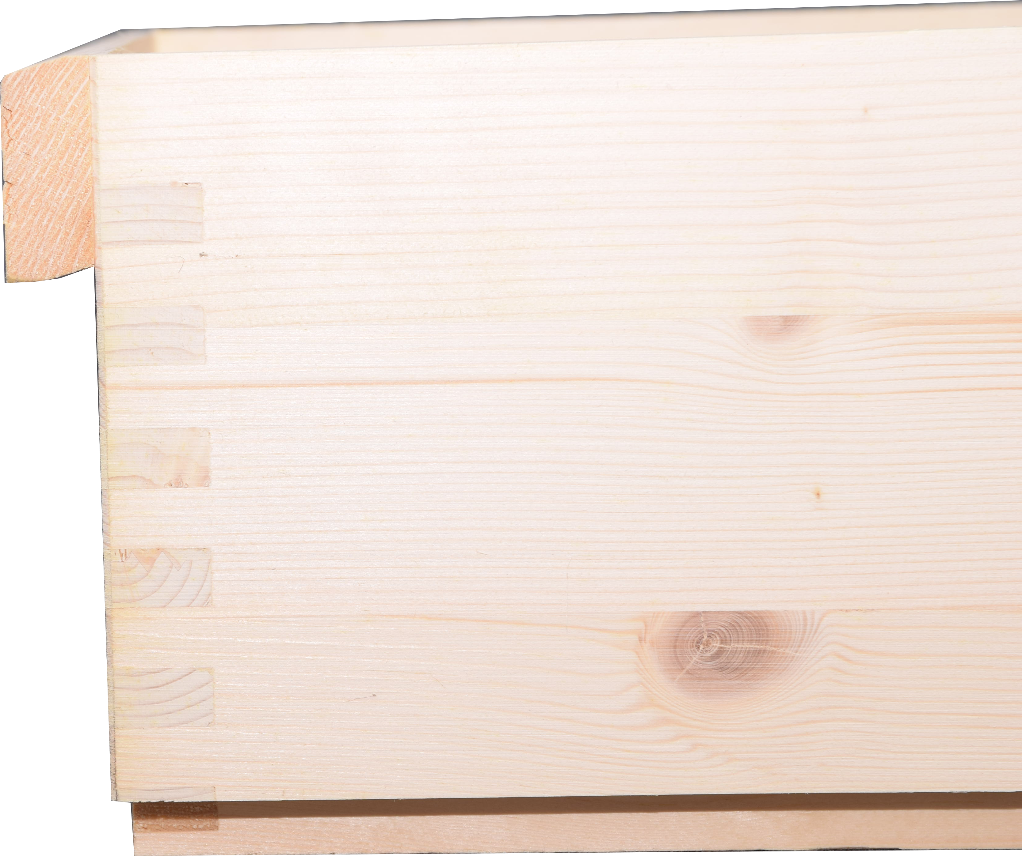 Kann entweder als Honig- oder als Brutraum verwendet werden. Einheitsmaß, Zander, Breitwabe und Kuntzsch mit je 2 eingefrästen Handgriffen. Duo und Quadrat werden mit 4 eingefrästen Handgriffen ausgeliefert. Einheitmaß, Zander, Quadratisch und Duo haben eine Gesamthöhe von 235 mm; Breitwabe und Kuntzsch eine Gesamthöhe von 265 mm.