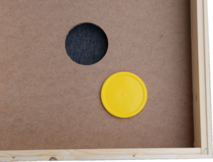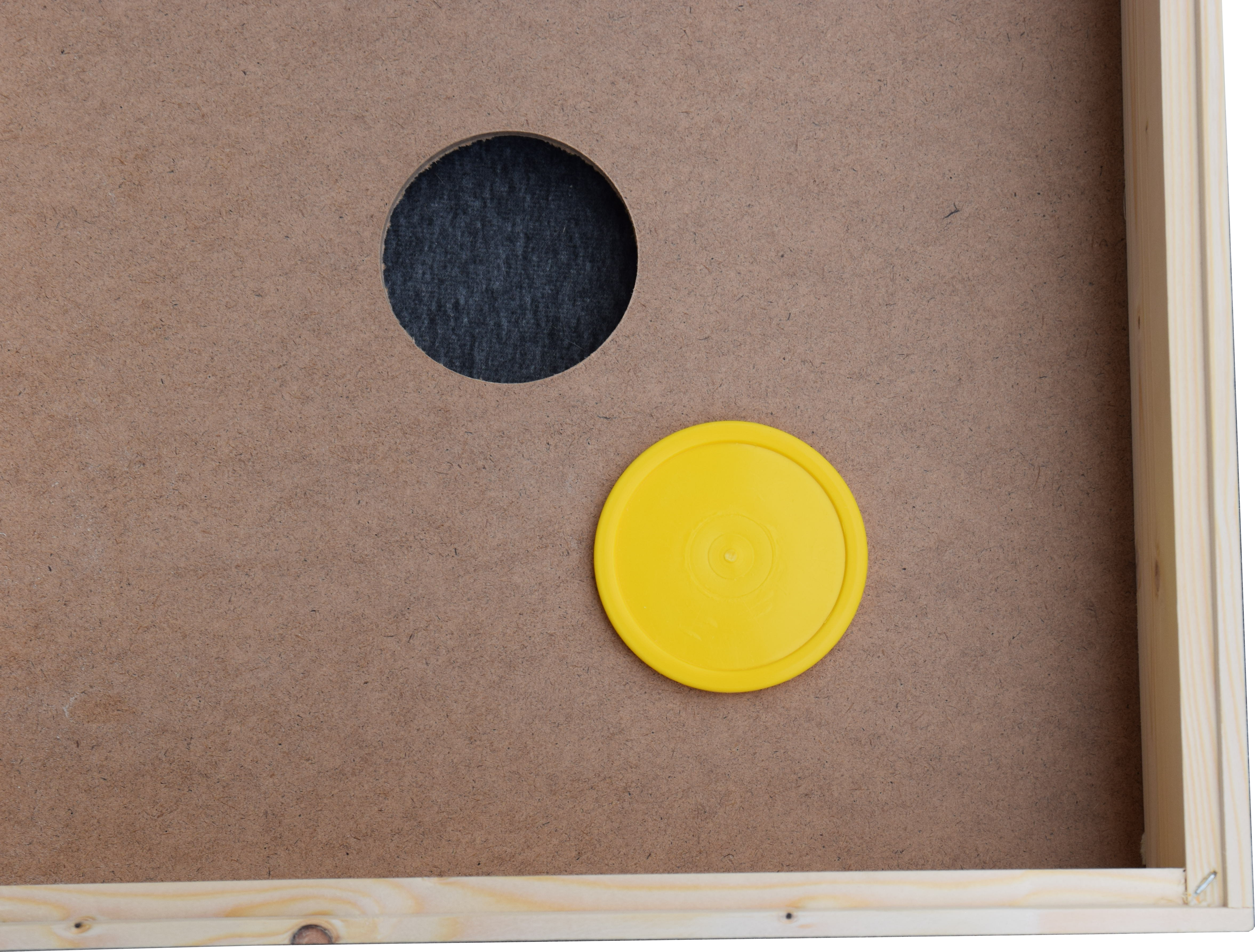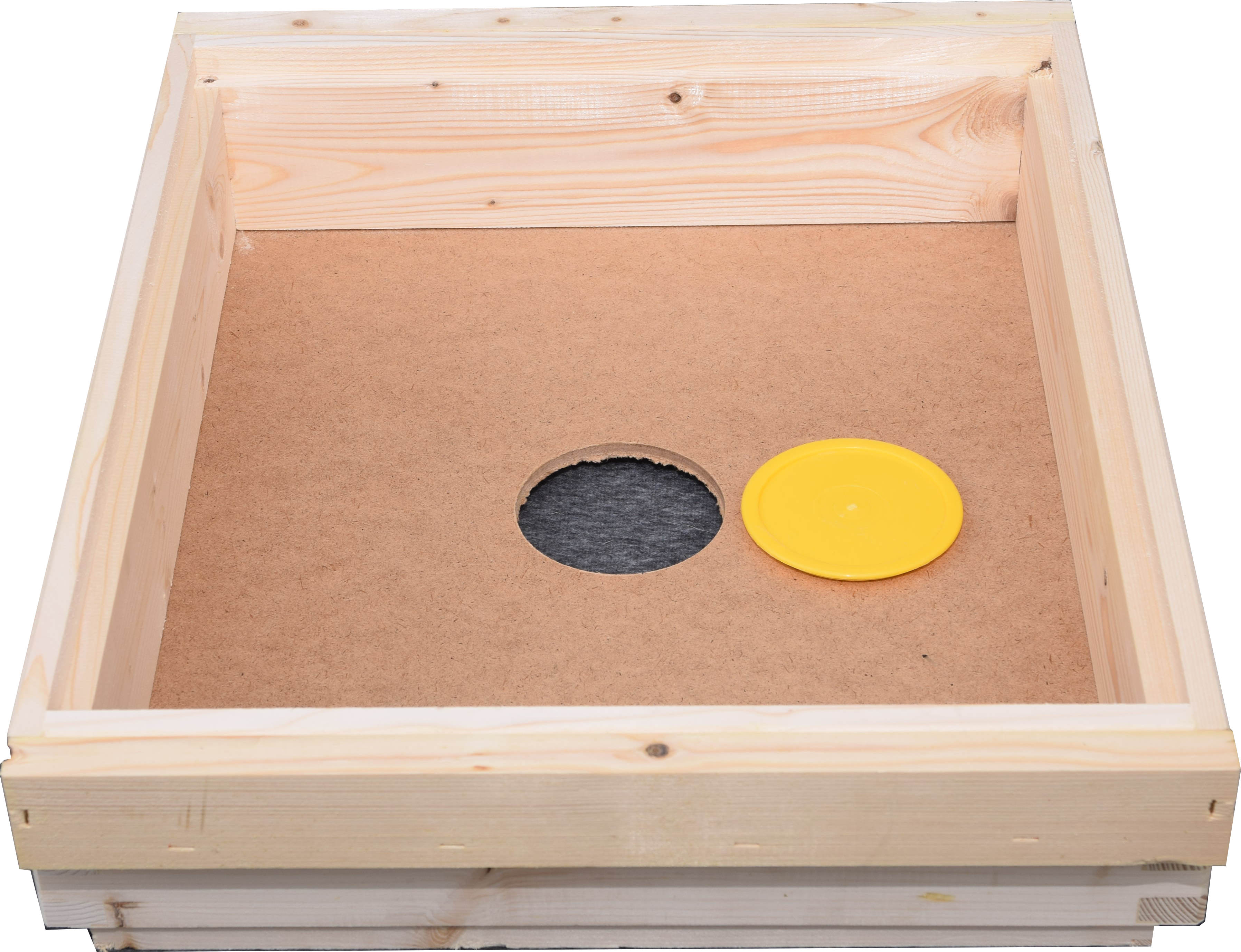 Der Futterdeckel bzw. die Futterzarge hat eine eingebaute 6mm starke Hartfaserplatte und ein Spundloch (Durchmesser: 88 mm). Die mitgelieferte gelbe Abdeckung dient zum Schließen der Öffnung. Die Futterdeckel sind gezinkt, verleimt und mit einer Klammer von der Oberseite zusammengebaut.