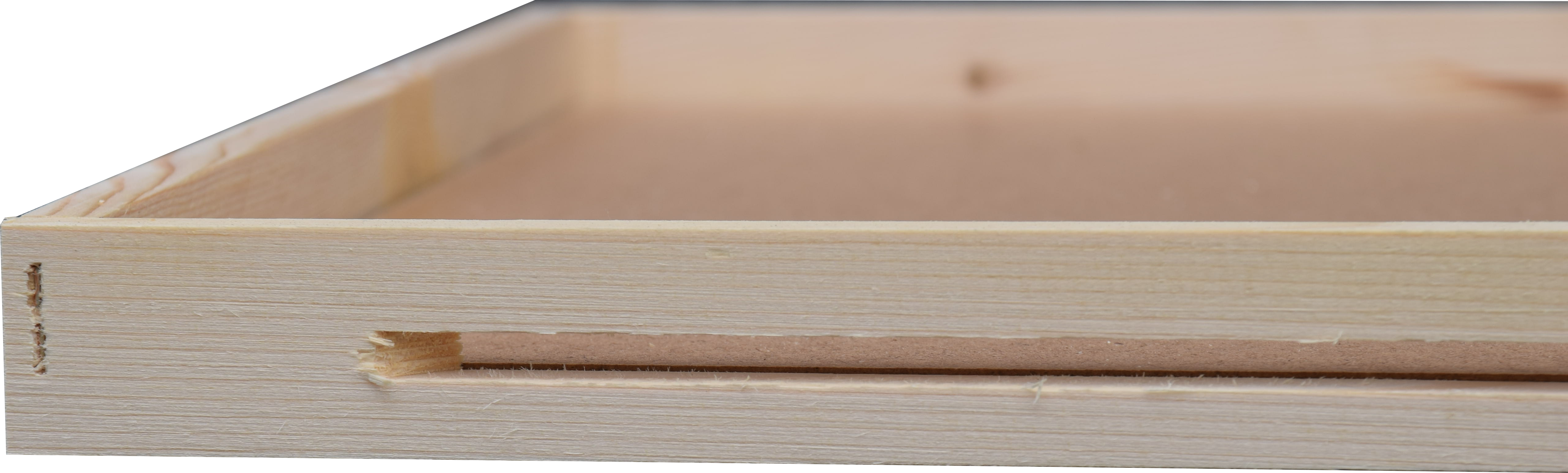 Baugleich wie die Vollzarge, nur mit einer Gesamthöhe von 175 mm. Sie verfügt genauso wie die Vollzarge über zwei eingefräste Handgriffe. Zargen sind gezinkt, verleimt und mit einem Nagel von der Oberseite zusammengebaut.