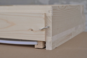 Sie besteht aus einem genagelten Holzrahmen, einer darüber befestigten Platte und einem Falz gegen ein Verrutschen auf der Unterseite.