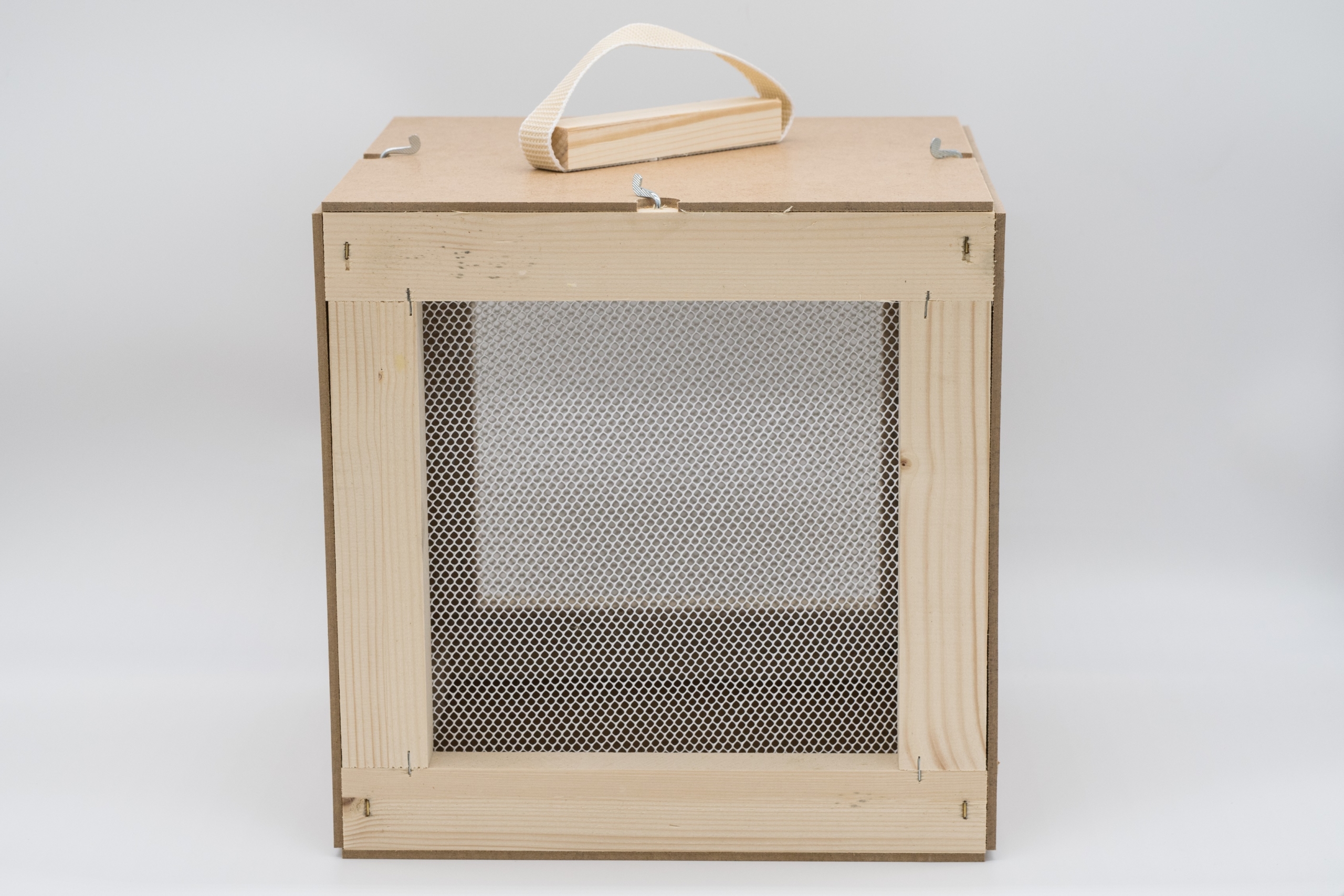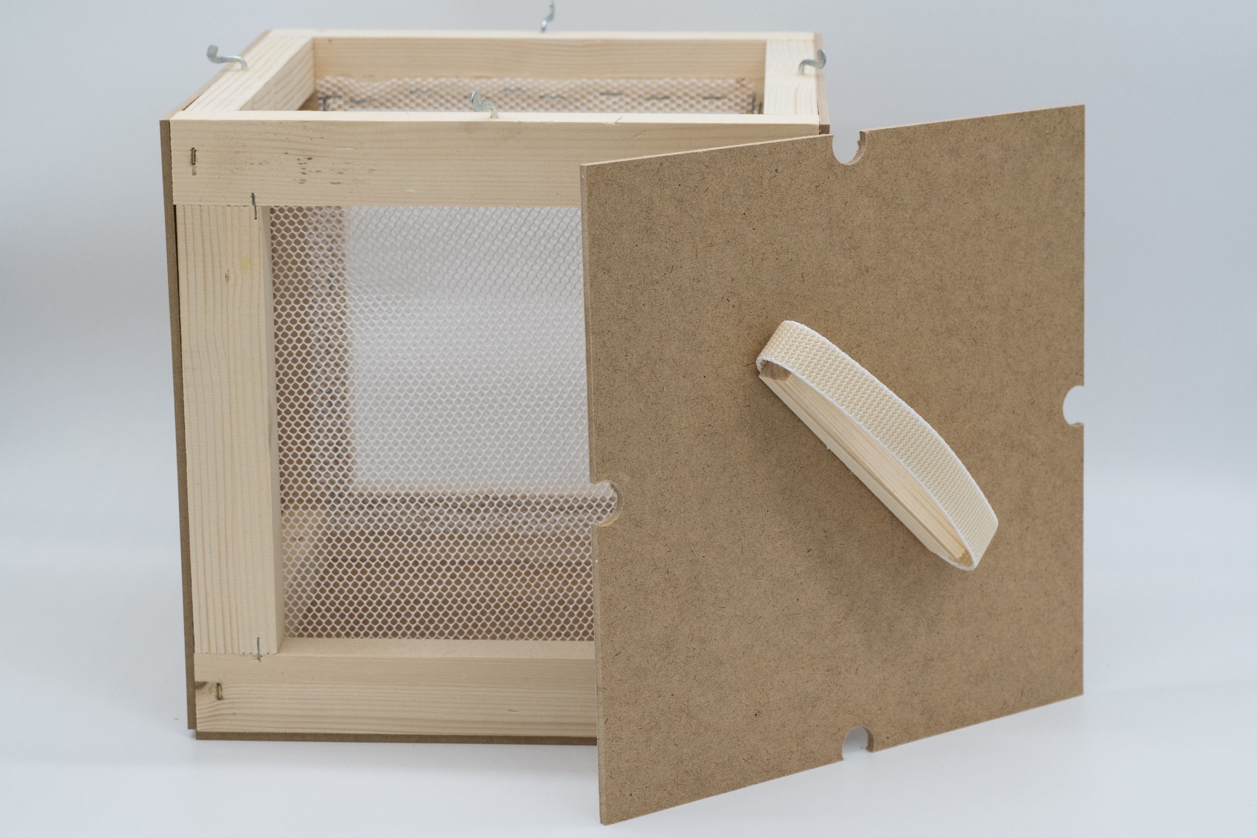 Schwarmkische geschlossen – gut zu sehen ist auch der Griff mit dem Stoffband auf der Oberseite Schwarmkistchen geöffnet